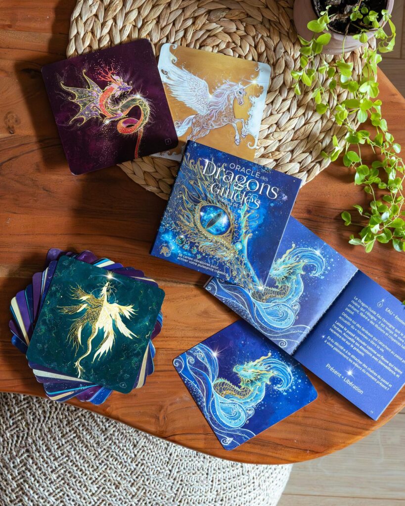 J’ai tout de suite été attirée par cet oracle, car il ouvre une porte vers un univers symbolique que j’aime profondément : celui des dragons, ces guides anciens, cosmiques, mythiques, dont l’énergie accompagne les évolutions intérieures et les passages importants.